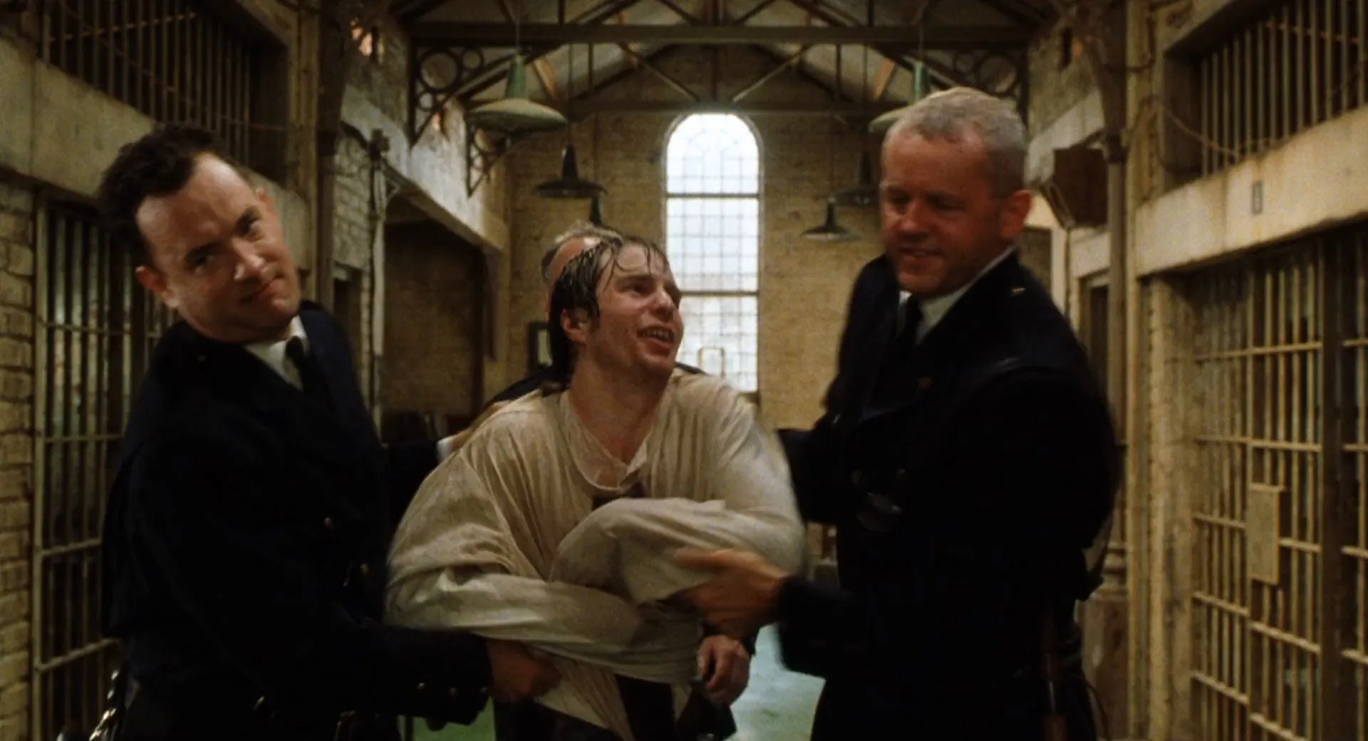 Cast: Tom Hanks as Paul Edgecomb, David Morse as Brutus "Brutal" Howell, Bonnie Hunt as Jan Edgecomb, Michael Clarke Duncan as John Coffey, James Cromwell as Warden Hal Moores, Michael Jeter as Eduard Delacroix, Graham Greene as Arlen Bitterbuck, Doug Hutchison as Percy Wetmore, Sam Rockwell as 'Wild Bill' Wharton, Barry Pepper as Dean Stanton, Jeffrey DeMunn as Harry Terwilliger, Patricia Clarkson as Melinda Moores, Harry Dean Stanton as Toot-Toot, Dabbs Greer as Old Paul Edgecomb, Eve Brent as Elaine Connelly, William Sadler as Klaus Detterick, Mack Miles as Orderly Hector, Rai Tasco as Man in Nursing Home, Paula Malcomson as Marjorie Detterick, Christopher Joel Ives as Howie Detterick, Evanne Drucker as Kathe Detterick, Bailey Drucker as Cora Detterick, Brian Libby as Sheriff McGee, Brent Briscoe as Bill Dodge, Bill McKinney as Jack Van Hay, Gary Sinise as Lawyer Burt Hammersmith, Rachel Singer as Cynthia Hammersmith, Scotty Leavenworth as Hammersmith's Son, Bill Gratton as Earl the Plumber, Dee Croxton as Woman at Del's Execution, Rebecca Klingler as Wife at Del's Execution, Gary Imhoff as Husband at Del's Execution, Van Epperson as Police Officer, David E. Browning as Reverend at Funeral, Tommy Barnes as Tower Guard (uncredited), Wes Hall as Prisoner (uncredited), Phil Hawn as Police Photographer (uncredited), Judy Herrera as Bitterbuck's Daughter (uncredited), Ted Hollis as Coffee Execution Witness (uncredited), Gower Mills as Inmate (uncredited), Garth Shaw as Inmate (uncredited), Jared Stovall as Inmate (uncredited), Todd Thompson as Prison Guard (uncredited)